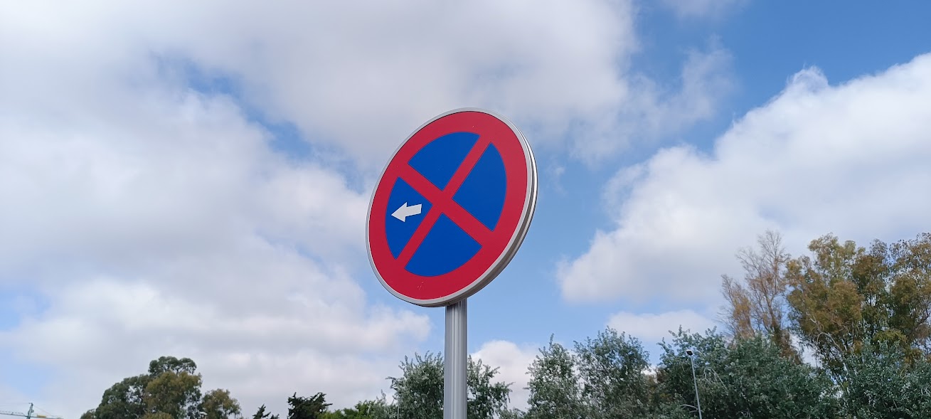 There is also a similar sign with an additional diagonal line from top right to bottom left, thus making a cross, which indicates that stopping or waiting is also prohibited, what in the UK we would refer to as a “clearway”, but in this article we want to specifically look at the no parking sign, because it doesn’t always mean you can’t park there.