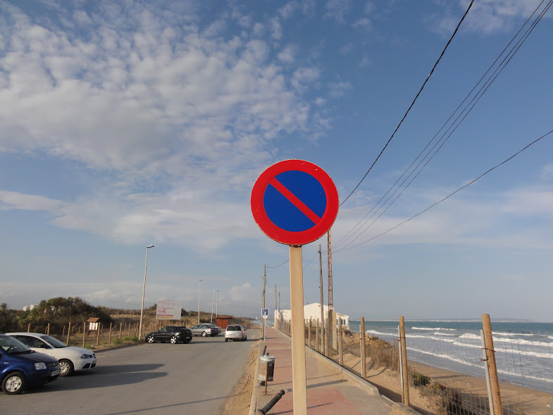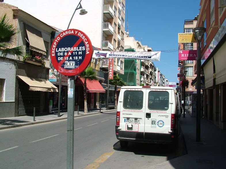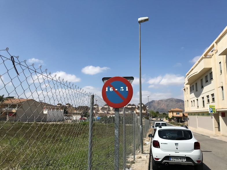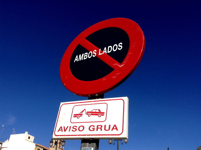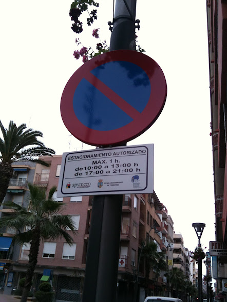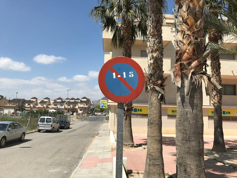 Although this seems confusing at first, the clue as to when you can or cannot park will always accompany the sign, either with clues on the circular sign itself, or on an additional plate below the sign, noting that in Spain when signs are on the same vertical pole they are related.