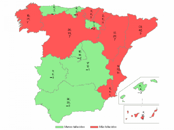 With respect to comparison of this year with the summer of 2017, the autonomous communities that have seen an increase in the number of deaths have been: Comunitat Valenciana (+13), Galicia (+11), Aragón and Castilla y León (+7), Canarias (+6), Catalonia, Comunidad Foral de Navarra and Basque Country (+3) and Región de Murcia (+1).