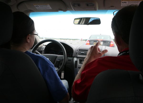 Cpl. Colleen M. Doyle, a radio operator with Combat Logistics Regiment 27, 2nd Marine Logistics Group, talks to her instructor while driving during the Richard Petty Driver Experience course at Marine Corps Auxiliary Landing Field Bogue, N.C., Sept. 21, 2011. The course focused on braking, reaction times, tailgating and loss of control. (Photo by Sgt. Rachael K. A. Moore)